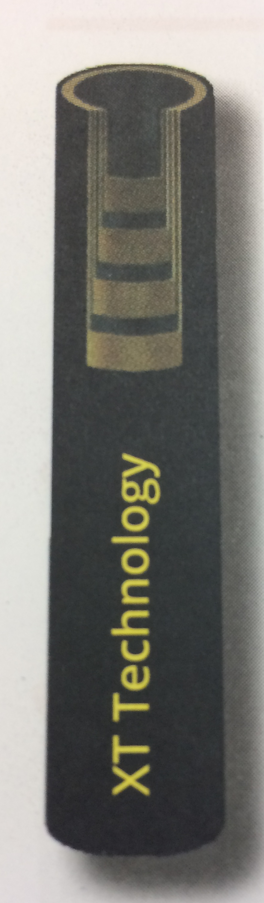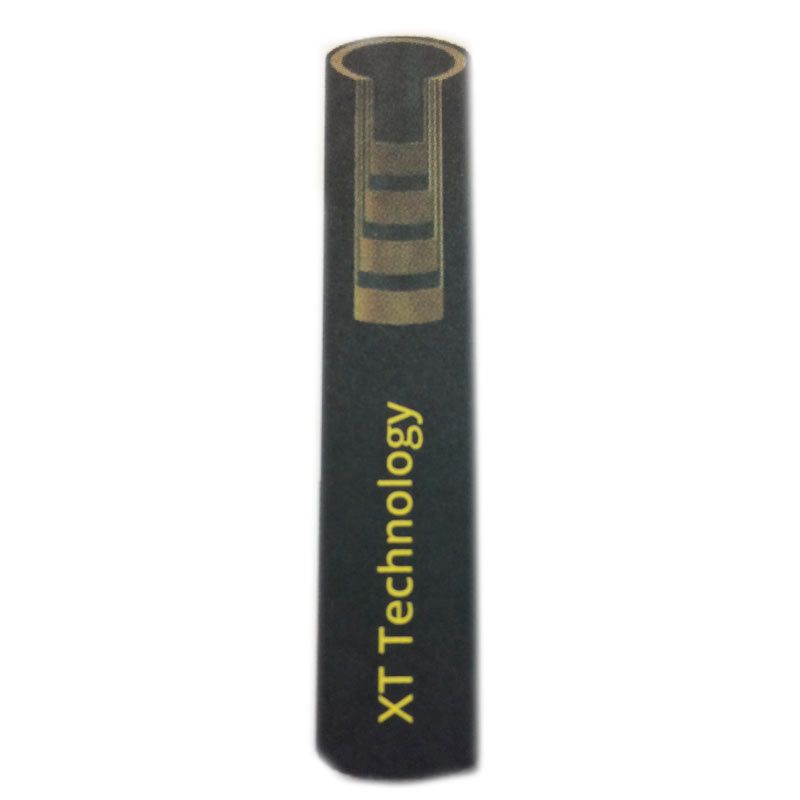 Boyau hydraulique avec un tube de caoutchouc synthétique et un renforcement de 4 spirales d’acier recouvert de caoutchouc synthétique noir.